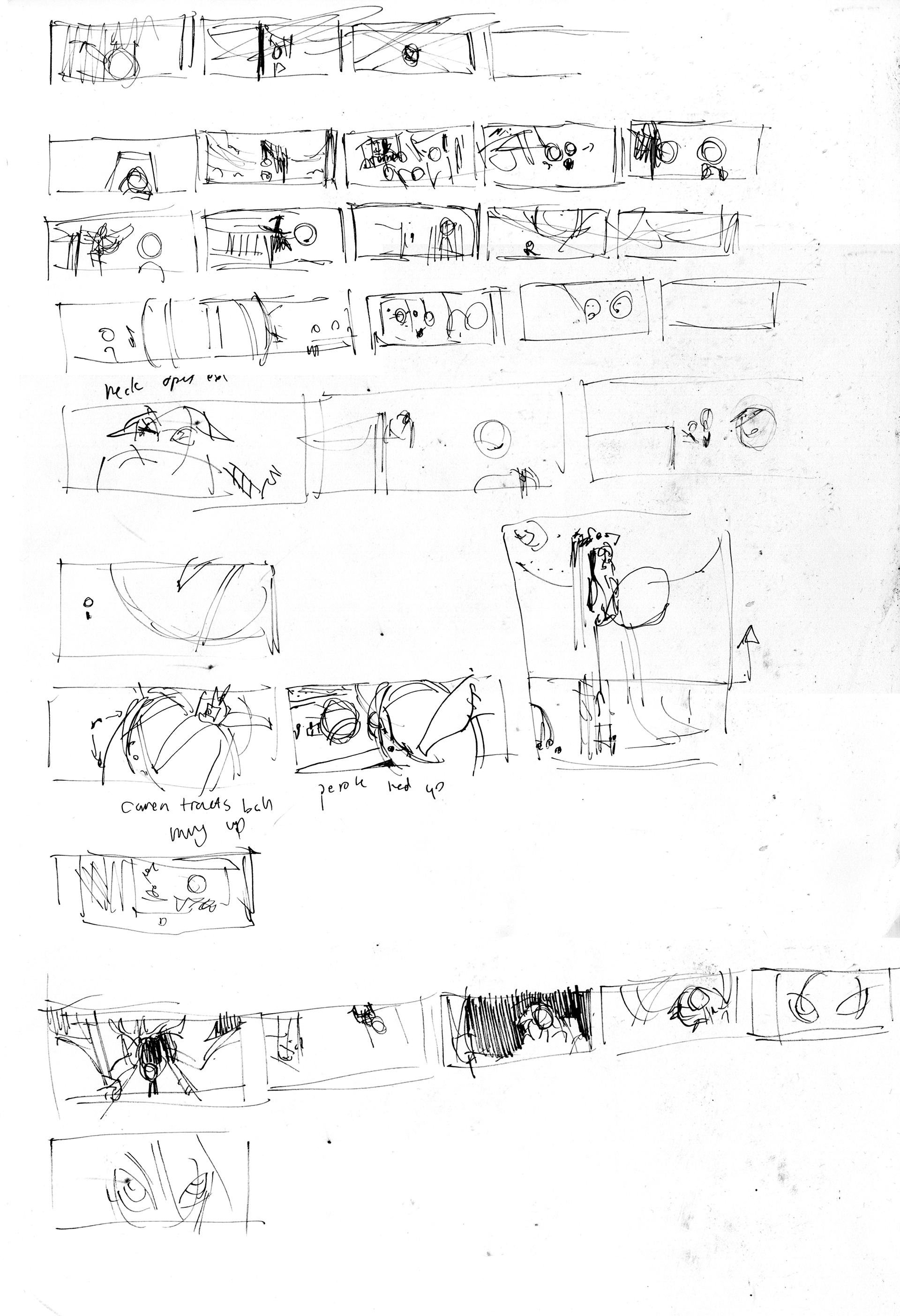 After the beats, I did a thumbnail pass and boarded the final boards on paper. Click or press the arrow keys to flip.
